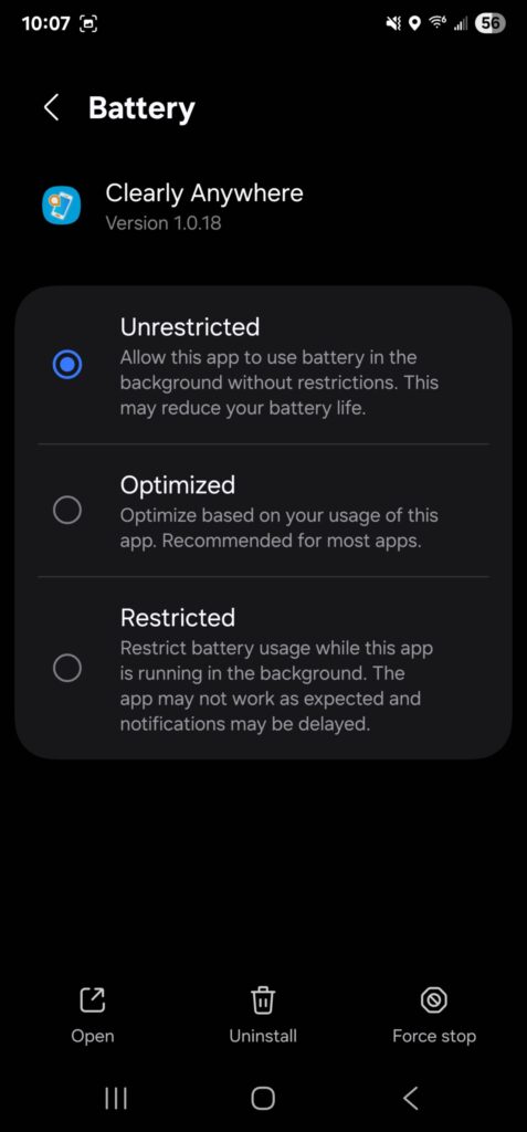 After this, set the battery settings to “Unrestricted”. Once this is done, the app will not shut down after you close it out.